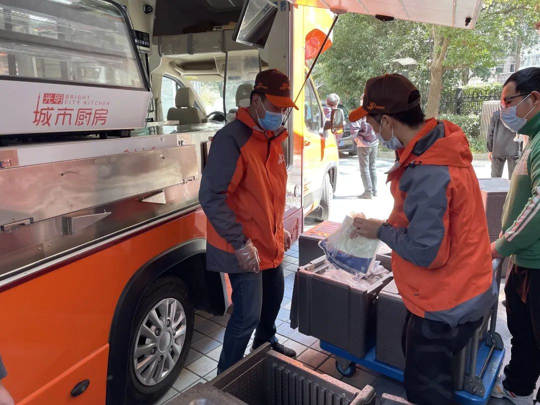 按照良友集团要求,公司连夜调派物资。由于光明餐车有一大半员工处于封闭管控中,仍在岗员工全员出动补位,一早就抓紧上货、有序发车。5部光明餐车流动服务于黄浦区内7个封闭管控点位。