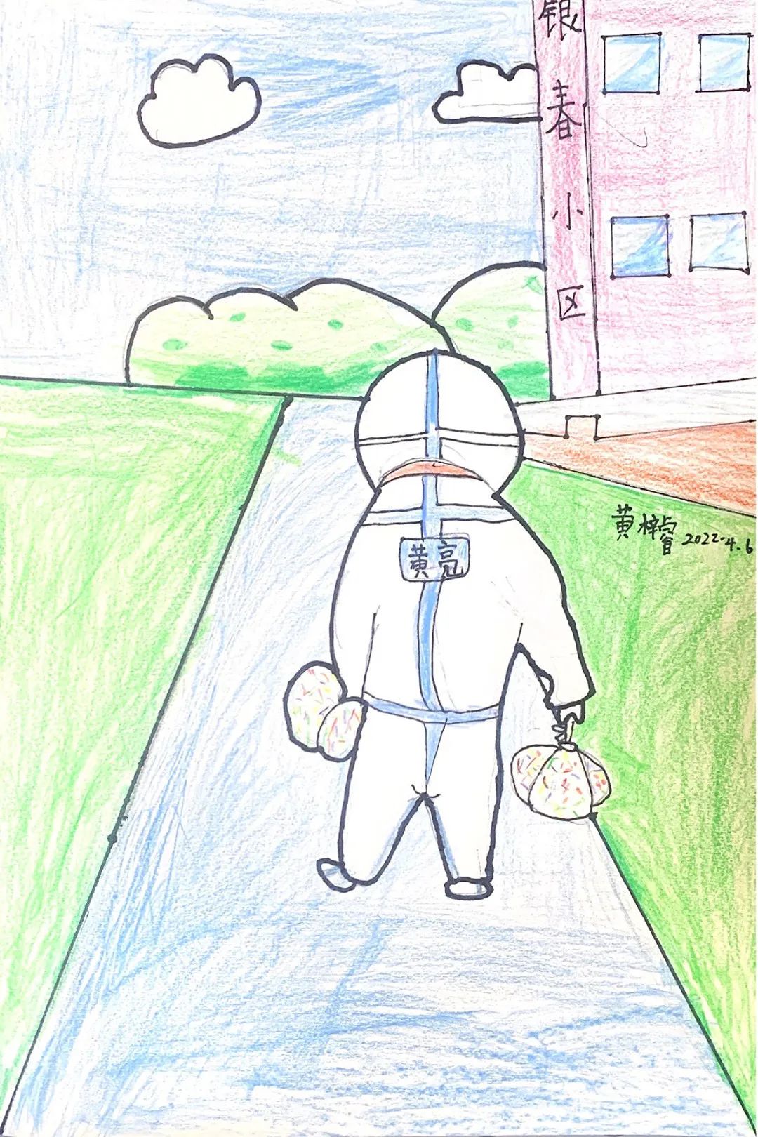 黄亮,市场营销部员工,共产党员,平时为人诚恳热心,同事们亲切的称他为“阿亮”。自从此轮疫情开始,他就响应号召,一直连续冲在抗疫第一线,哪里有需要,就冲到哪里当志愿者,不辞辛劳,毫无怨言,截止4月7日,黄亮已累积当志愿者18天,几乎每天都在当志愿者。除了当志愿者,他还不畏感染风险,多次按要求开车前往政府指定的市场、商超,肩负着江川路街道、社区的物资采购工作,为街道、社区提供物资保障。白天家里基本见不到他的身影,他每天都忙碌在维持秩序、协助核酸采样、分发抗疫物资等志愿者工作上,这段时间早出晚归,他儿子记住了爸爸变成“大白”的画面,于是给他画了一幅画,稚嫩的小手没有画出老爸魁梧的身材,但却画出了老爸义无反顾、勇敢逆行的精气神,这是一幅充满着大爱的画,从一个小孩的视角,让我们体会到什么是责任担当,什么是父亲坚强的脊梁。