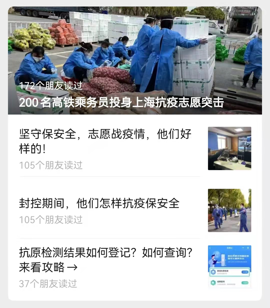 集团公司党委宣传部、融媒体中心坚守舆论阵地,及时采写新闻,发布服务资讯信息,讲述上铁人抗疫好故事,传播了上铁正能量。