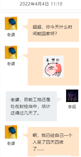 这段被小编扒出来的是申通地铁建设集团21号线项目管理分公司项目经理李超与他妻子的聊天内容。从中可以看出近期建设集团选择驻守工地的项目管理分公司干部职工们的真实故事。