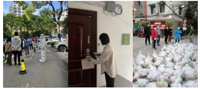 党总支书记胡章喜同志带头向社区报到,并先后参与社区疫情防控志愿者工作14次,包括核酸引导、分发抗原试剂盒、发菜、团购物资转运分发等。4月12日深夜,接到小区居民团购物资到达的通知,立即带上自家的小推车,赶到卸货点,与团长、志愿者一起对物资进行分装、核对数量和品种,包装袋表面喷洒酒精后转运到楼栋,再分送到各家门口,全部工作完成已是凌晨1点多。