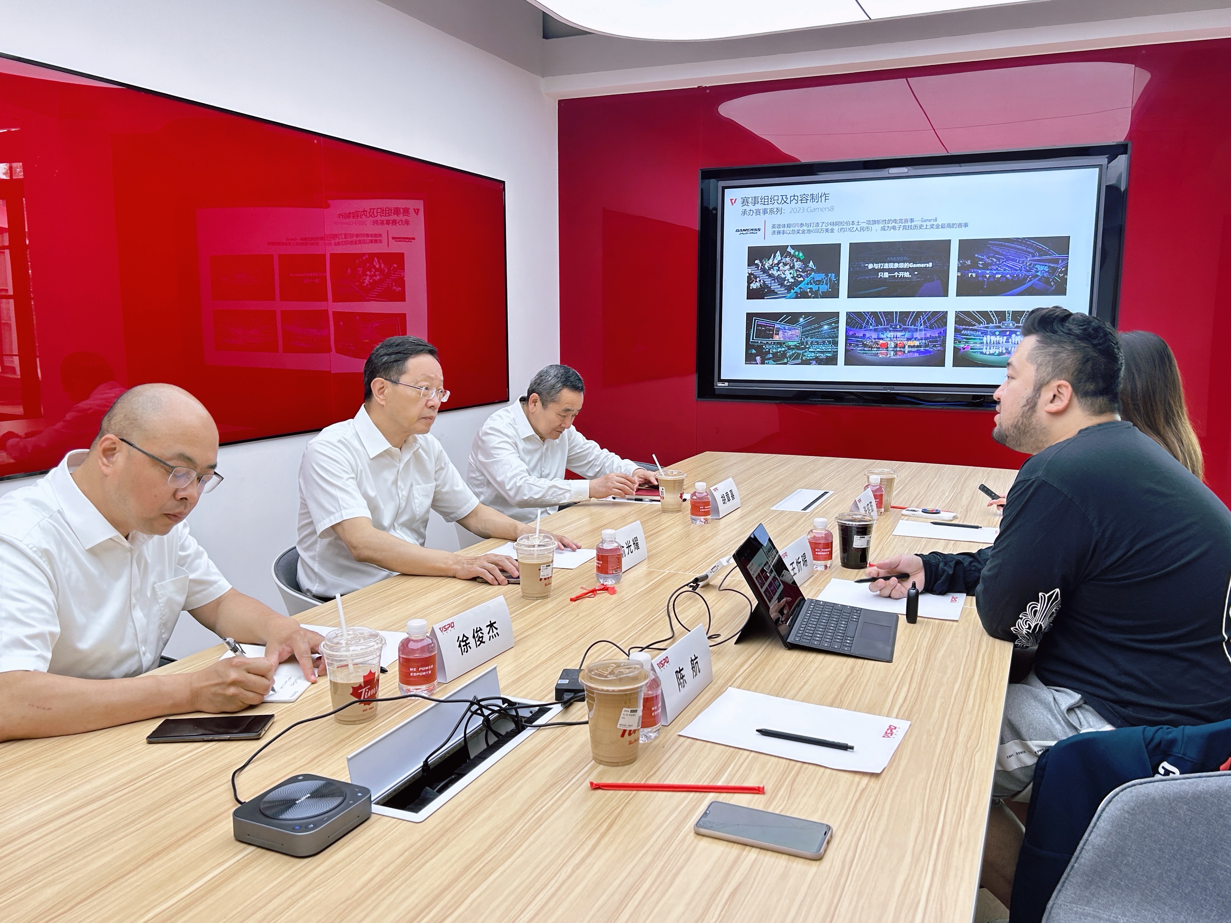 英雄体育VSPO联合创始人、兼执行董事王忻晹陪同俞会长一行参观了上海总部、公司党建荣誉墙、 演播厅、全球制作中心等,并现场介绍了赛事技术的发展应用,以及数字化内容制作和远程信号制作的技术路径。