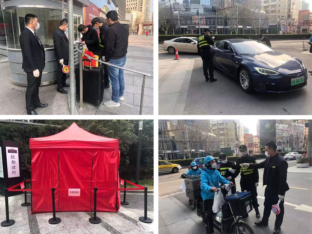 为配合体温检测的工作,大厦前门只开一扇边门,大厦后门只出不进。通往裙房商场及车库的通道门临时关闭,确保所有进入大厦的人员必须经过一楼大堂体温测量点。