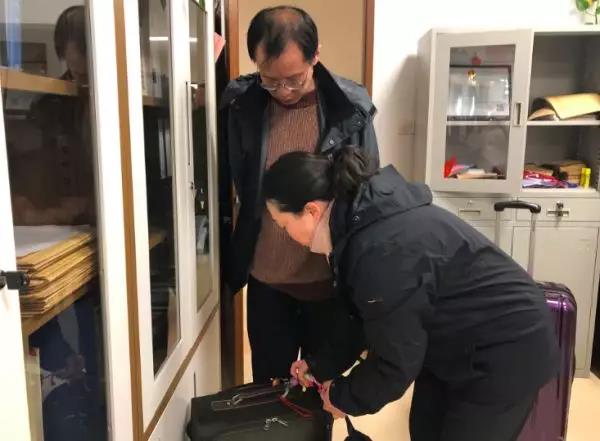 图说:老公来送行,交代细节,果敢的护士长给行李箱绑上同事送的幸运结