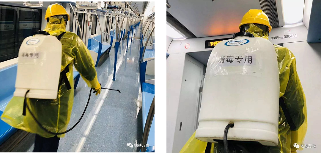 保洁员们每晚都要背60多斤重的消毒水箱,仔细对地铁车厢每个角落进行消毒,据统计,每消毒一列车,他们就要走上200余步,按照每晚消毒25列车计算,这样每天就多走出5000余步。