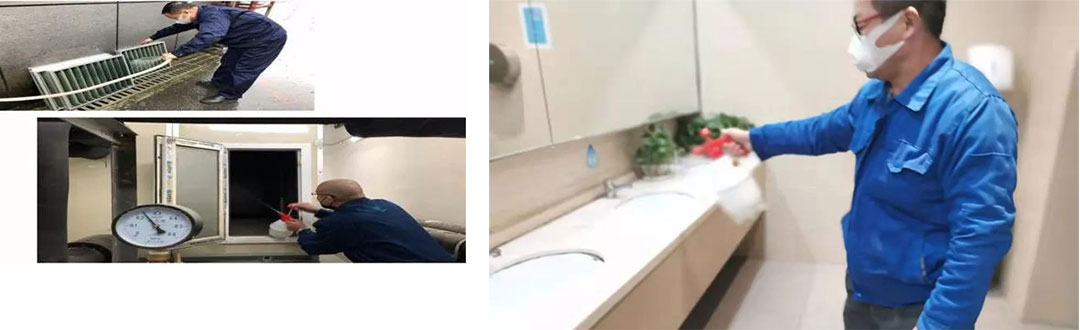 张芸火速向业主方申领到防毒口罩,分发给员工佩戴,并配置好非接触测温仪,严格要求员工岗前全部进行体温检测,根据国家告知的疫情症状,做好自我“诊断”并每日进行登记记录。“先锋三人组”带领保洁人员紧锣密鼓地对电梯间、大堂、各处防火门的门把手、楼道、卫生间等公共区域进行全面的消毒,并填写每日消毒记录表;对雨水沟、污水井、垃圾房等室外重点部位和卫生死角进行重点清洁消杀,尽量减少外界细菌污染,并将购物中心出入口的软帘进行拆除,保持通风。要求设备人员定时对风机、机箱等进行全面消毒,降低空气污染。