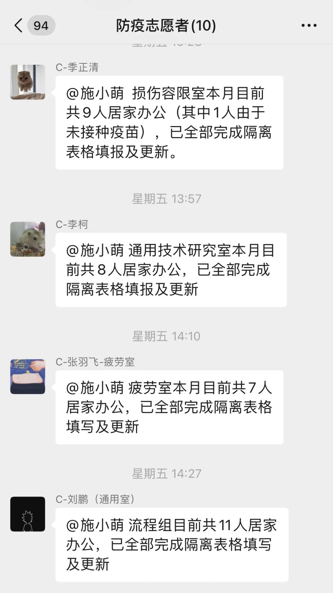 疫情防控任务重,机体集成部青年主动担任志愿者,分担部门信息统计等繁重工作。